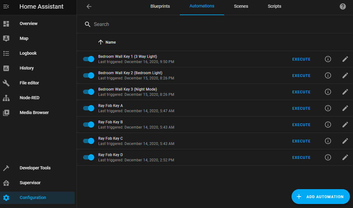 As you can see, I already have a few setup. Don't worry, yours will likely be empty. We will fix that here in a few minutes. I have an Automation defined for each key on each controller. This allows me to make a key do a series of things, or just 1 thing. I can also disable the automation which will in a sense disable the key on the KeyFob or Button on the wall. No ugly YAML, and very easy to setup. There is 2 ways to make this work.. One is kind of ugly, which is workable and I will show you in a moment. The other method is easy, however you will have to add 1 Rule on the RF Bridge. But this one rule will save you days of headache when you decide to create further automations or binary sensors in YAML (A article for another day). So lets "+ Add Automation" and start with the ugly way: