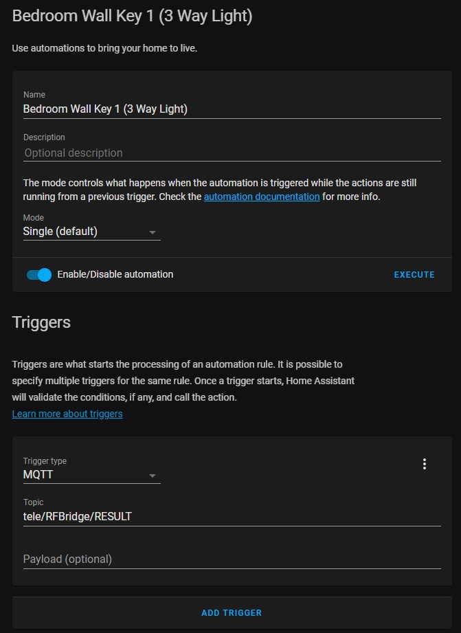 So what is the not Ugly way to do this? I'm glad you asked... With 1 Rule is Tasmota on the RF Bridge, you can extract the Data and Publish it seperately from the RESULT. This will allow us to assign the Key Data to the Payload under Trigger, eliminate the "Template" and go directly to the "Action." This will also help us later if we need to define binary sensors in YAML and eliminate all the template stuff there as well making a binary sensor very easy to define.
