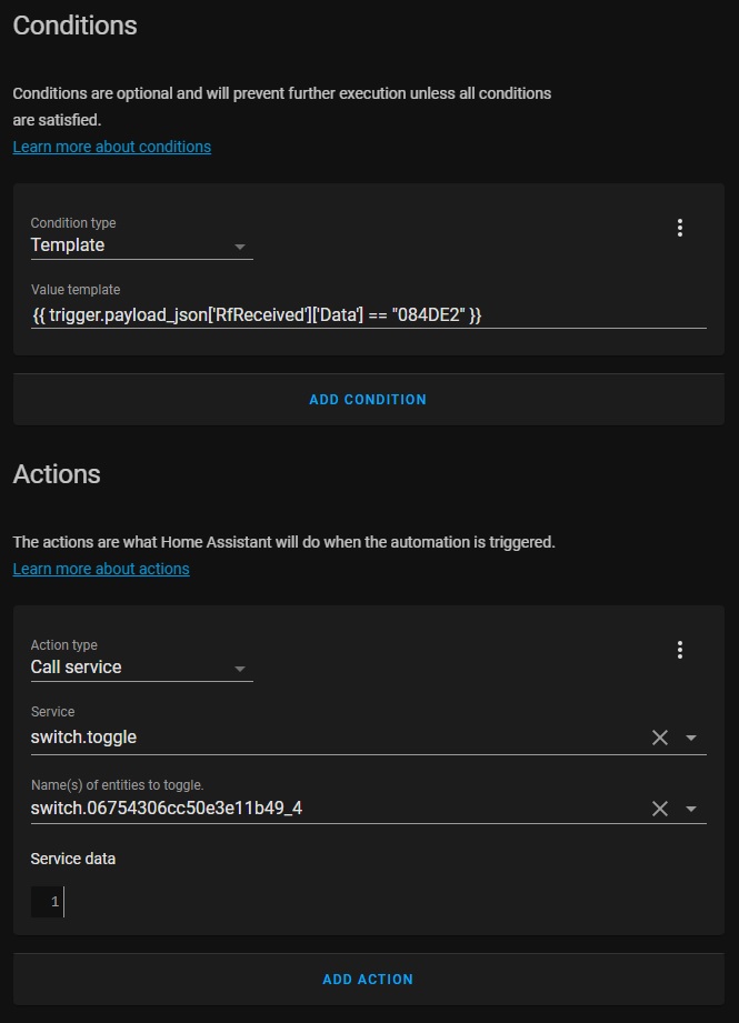 So you simply name the Automation, set the Trigger Type to MQTT and assign the topic. In this case the topic is "tele/RFBridge/RESULT" because we set the topic on the RFBridge during configuration of MQTT to RFBridge. If you picked a different name then you will have the change only the "RFBridge" part of that Topic. Here comes the ugly. We don't want to specify a Payload here because the result is being returned as JSON... So this rule passes every time a Message gets published to "tele/RFBridge/RESULT". In order to get the information we need, we need to create a template. This time a template condition to breakdown the JSON and get the "Data" we need. So once again through the magic of Screen Capture: